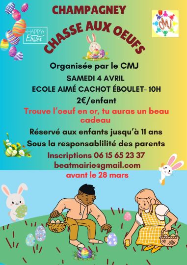 Chasse aux oeufs le samedi 04 avril de 10h à 12h à l'école Aimé Cachot.
